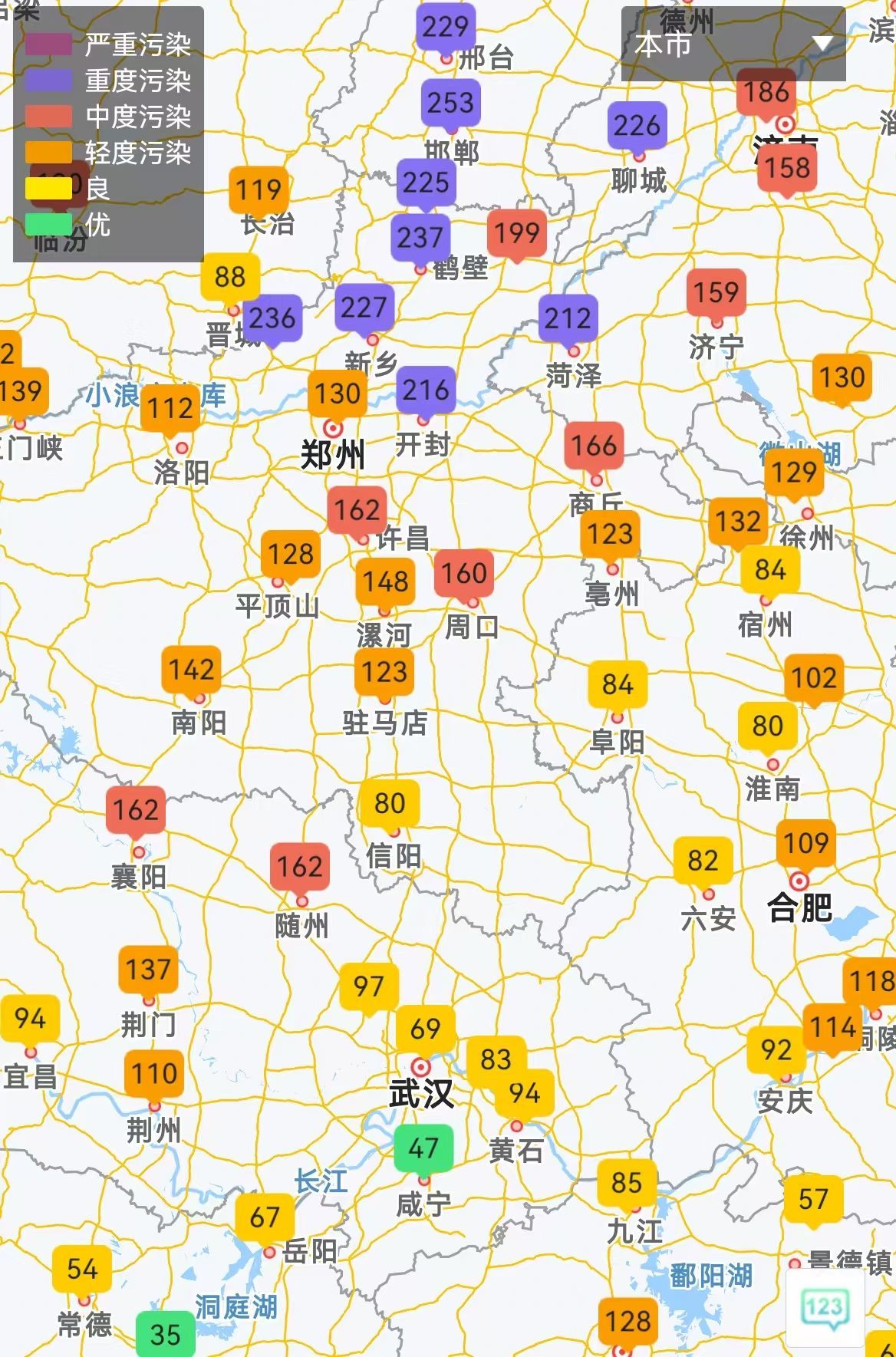 目前,京津冀、山西、陕西、河南、山东、安徽、江西等地部分城市为中度到重度污染,首要污染物为PM2.5。省内随州、孝感为重度污染,武汉、襄阳为中度污染,其他城市空气质量为良到轻度污染。