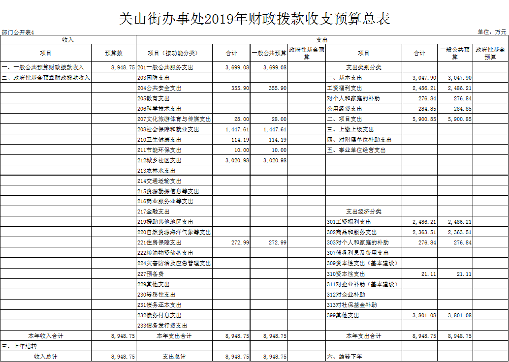 全年预算安排收入8948.75万元,比2018年预算增加2037.13万元,增长29.47%;支出8948.75万元。全年预算收支平衡。
