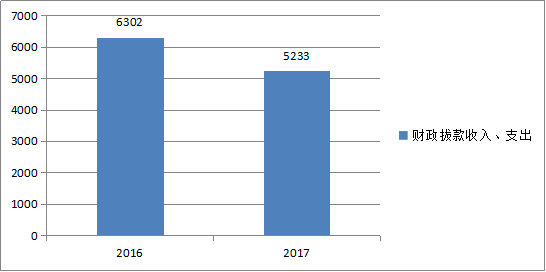 2017年度财政拨款收、支总计5,233万元。与2016年相比,财政拨款收、支总计各减少1069万元,降低16.96%。主要原因是暂存款指标归类至其他收入。