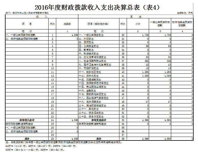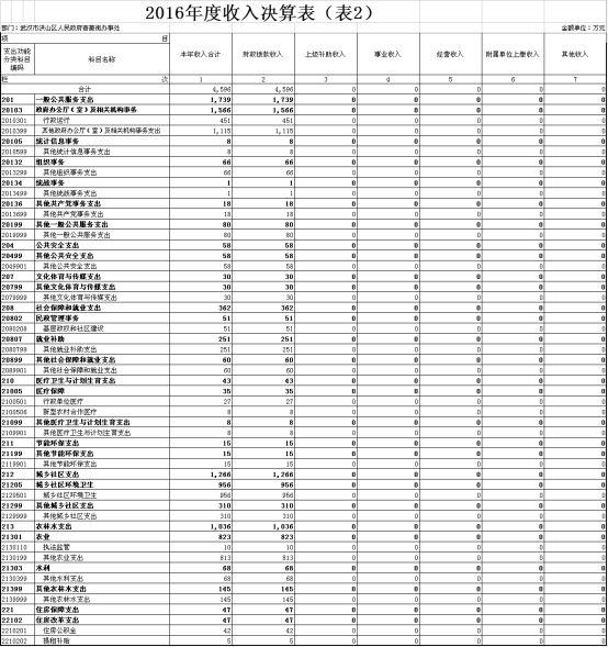 2016年度收入总计4596万元,支出总计4596万元。与2015年相比,收、支总计各增加 1417万元,增长 44.57%,主要原因是正常人员工资等人员经费调整、文明创建经费、综治经费、城乡环境卫生管理经费补助增加。