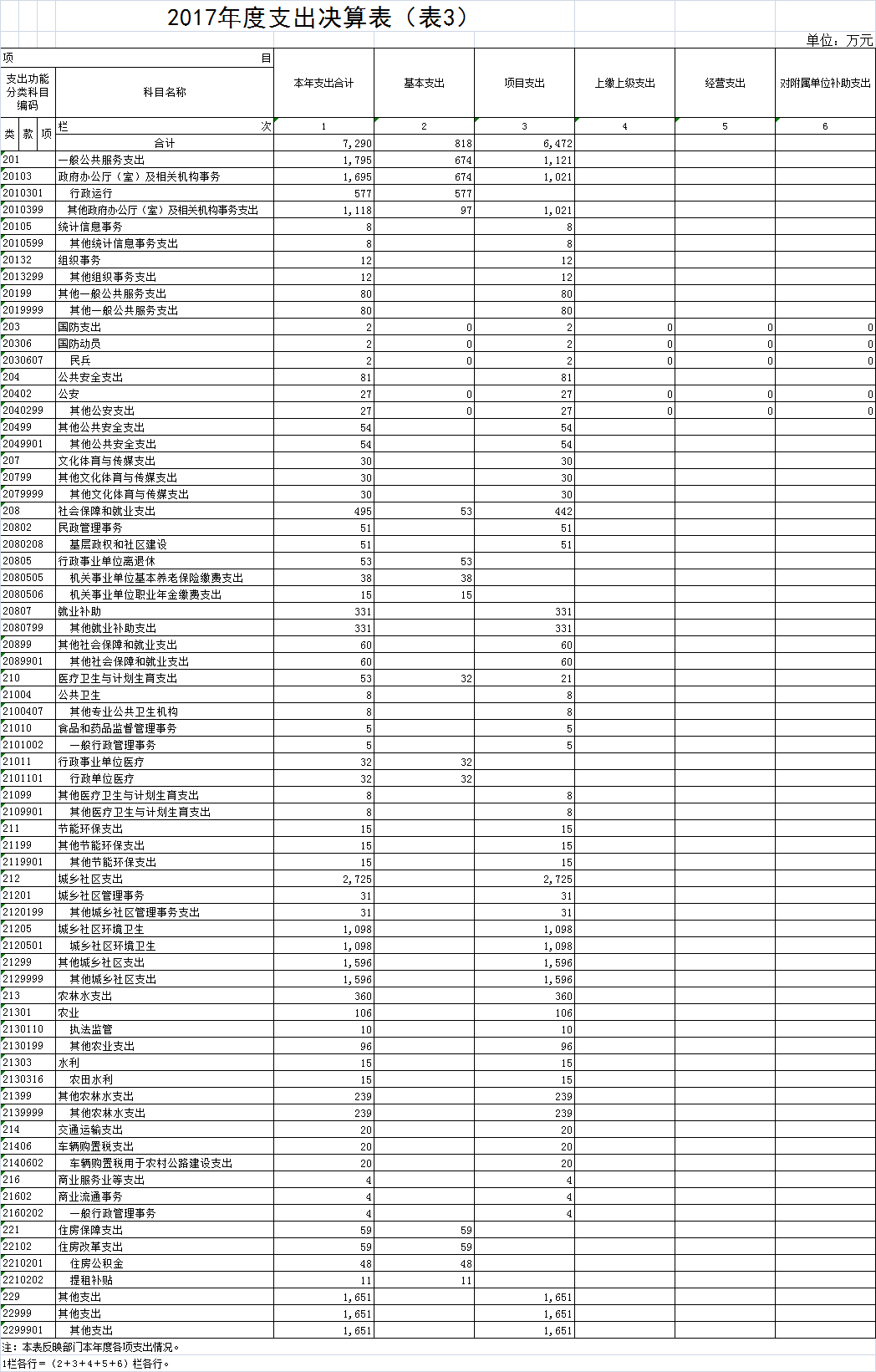 2017年度本年支出合计7,290万元。其中:基本支出818万元,占本年支出11.22%;项目支出6,472万元,占本年支出88.78%.