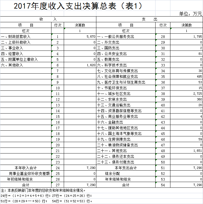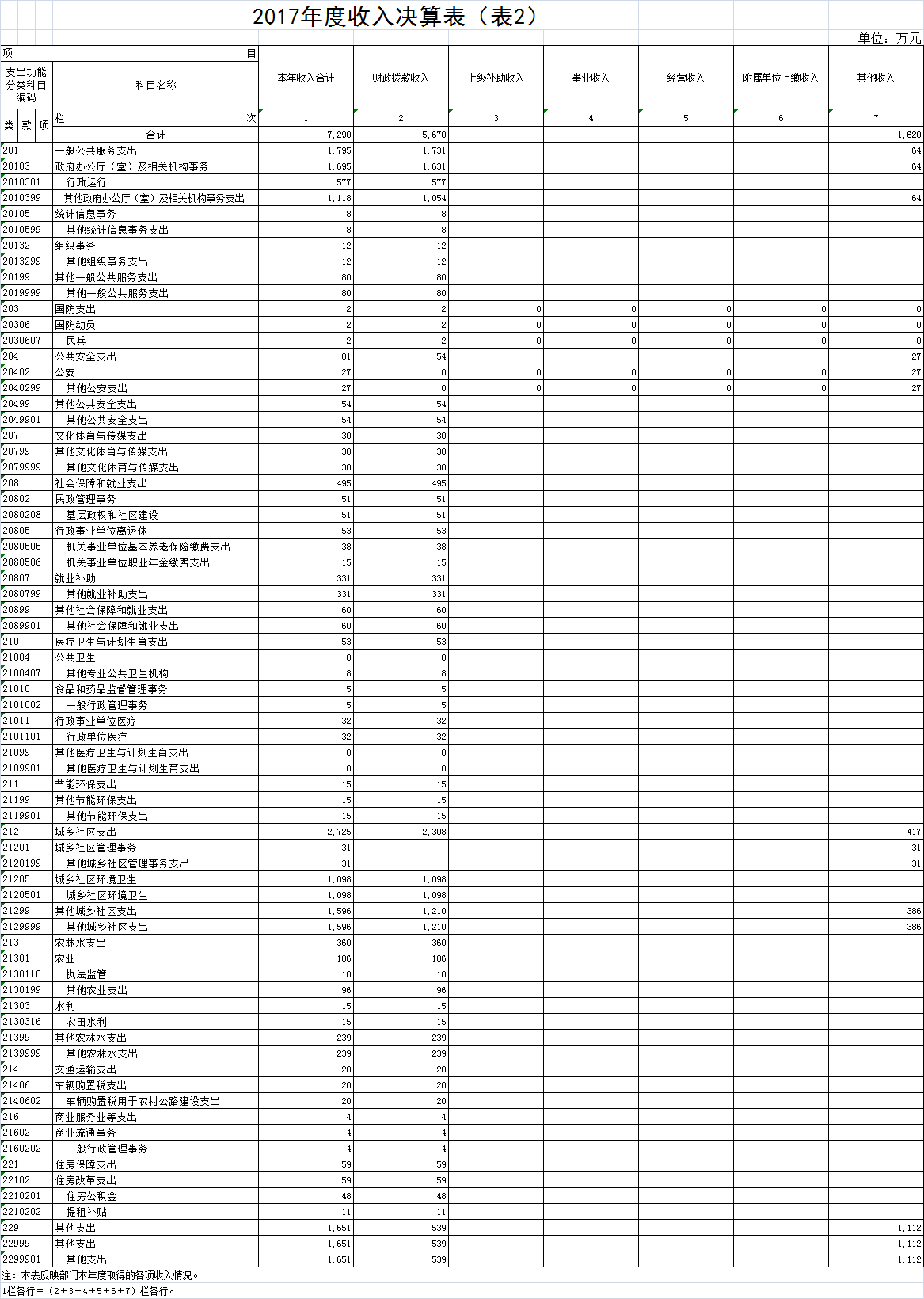 2017年度收、支总计7,290万元。与2016年相比,收、支总计各增加2,694万元,增长58.61%,主要原因是正常人员工资晋档晋级调整、养老保险金、职业年金、残保金的缴纳等人员经费调整、其他城乡社区、农田水利、农村公路建设、其他城乡社区管理事务、大城管专项经费、执法中队专项经费、其他支出经费补助增加。