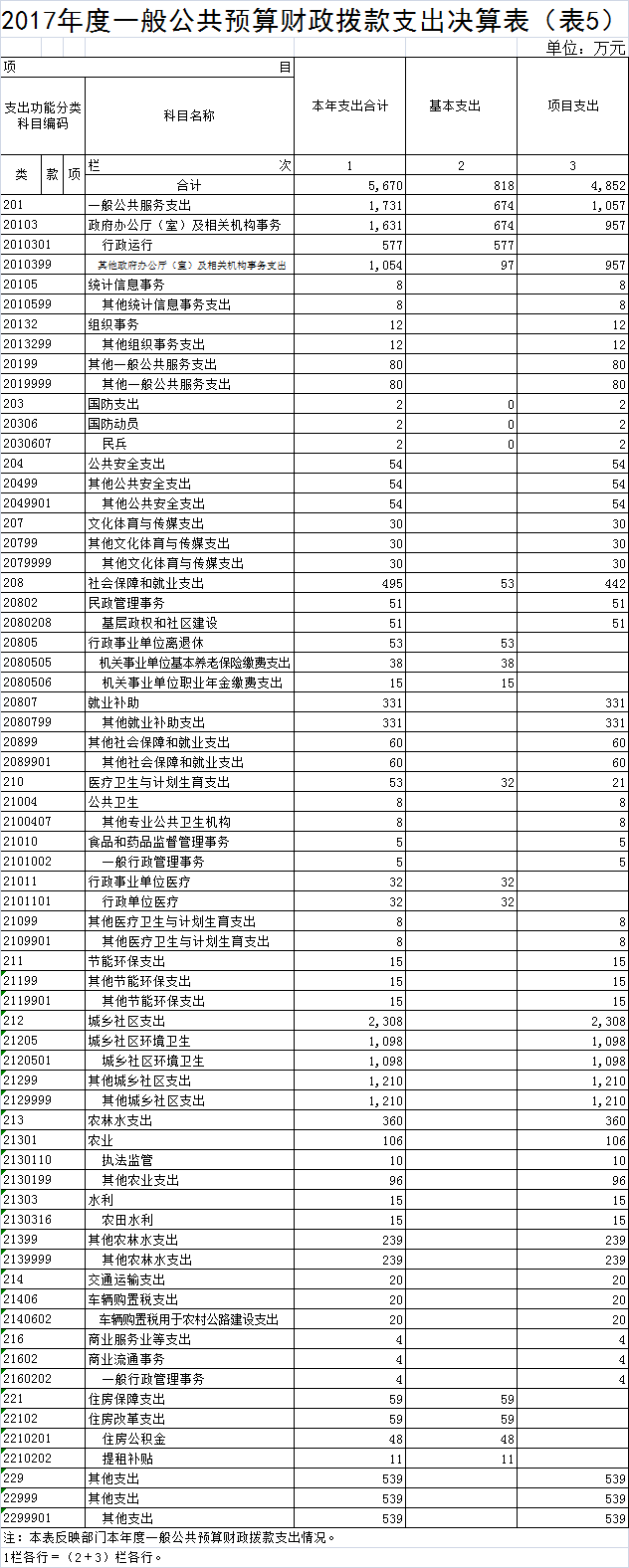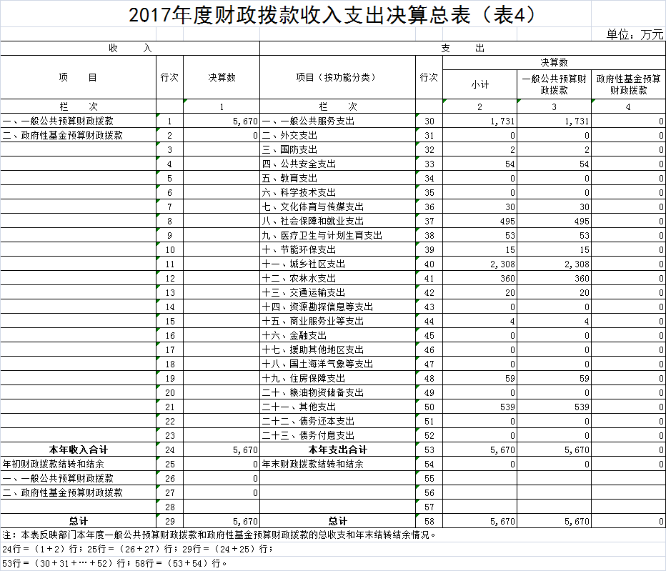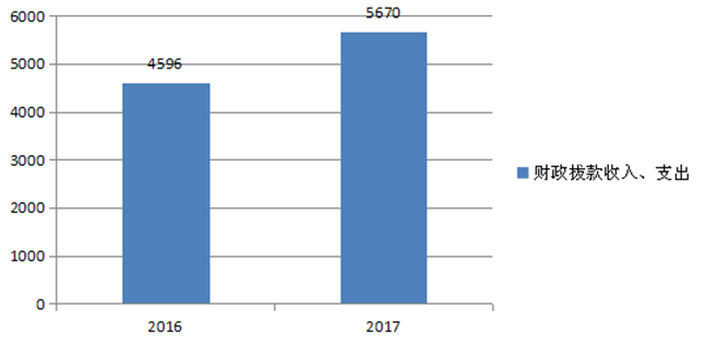 2017年度财政拨款收、支总计5,670万元。与2016年相比,财政拨款收、支总计各增加1,074万元,增长23.37%。主要原因是正常人员工资晋档晋级调整、养老保险金、职业年金、残保金的缴纳等人员经费调整、其他城乡社区、农田水利、农村公路建设、其他城乡社区管理事务、大城管专项经费、执法中队专项经费、其他支出经费补助增加。