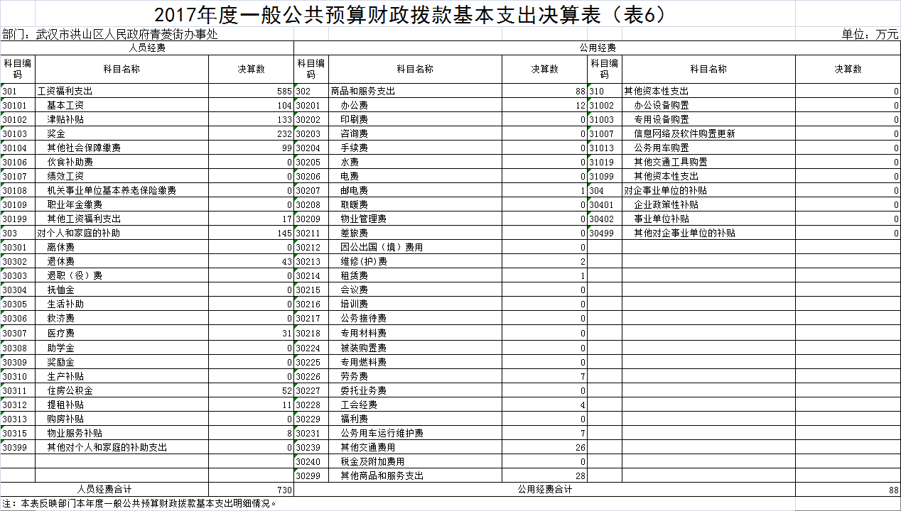 2017年一般公共预算财政拨款支出年度预算为5,672万元(包括年初部门预算、基本建设等专项资金、上级下达的专项转移支付资金及年初结转和结余资金等),支出决算为5,670万元,完成年度预算的99.96%。其中:基本支出818万元,项目支出4,852万元。项目支出主要用于办公设备购置 14.23 万元,主要成效改善了街道办公设备更新,提高办事效率;安全生产经费含消费经费30万元,主要成效提高了辖区企业安全生产意识,定期对企业安全生产隐患的排查,保证企业单位的安全;服务企业工作经费60万元,主要成效服务辖区企业,让企业良性发展;各部门经费100万元,主要成效是街道各部门正常运行;关工委工作经费3万元,主要成效对辖区青少年进行正确的思想教育;机动经费300万元,主要成效对辖区突发事件及不可预见事项及时应对处理;街办公楼租金159万元,主要成效保证街道基本办公用房;街乡普法经费5万元,主要成效对辖区居民进行普法宣传,提高居民法治意识;街乡人民调解员4.5万元,主要成效是用于街乡人民调解员工资报酬;街治安巡逻员经费52万元,主要成效是用于街治安巡逻员工资;精准扶贫工作经费3万元,主要成效是用于对新洲区铁河村驻村队员的生活、交通补助及队村民的困难补助;劳动保障专项经费8万元,主要成效是队辖区失业人员的就业政策宣传、培训;聘请法律顾问经费5万元,主要成效是街道法律咨询;青菱都市工业园公交微循环线路专项经费30万元,主要成效是对公交公司青菱都市工业园公交微循环线路的补贴;"三旧"改造工作经费20万元,主要成效是辖区"三旧"改造;武装部专项经费8万元,主要成效是辖区征兵工作宣传及征兵工作;信访维稳经费100万元,主要成效是辖区信访维稳工作;青菱防汛值班补助55万元,主要成效是2016年防汛值班补助;统计工作经费8万元,主要成效是对辖区经济普查和统计;社区基层党组织活动经费12万元,主要成效是社区基层党组织活动;文明创建经费80万元,主要成效是文明创建工作;人武部社区民兵工作经费2万元,主要成效是社区民兵工作训练;街乡人民调解委员会工作经费1万元,主要成效是街乡人民调解委员会工作;社区法务工作室经费3万元,主要成效是社区法务工作室工作;综治经费50万元,主要成效是公共安全工作;文体科普专项补助经费30万元,主要成效是辖区文体科普工作的开展;社区村管理工作经费51万元,主要成效是社区村管理工作经费;临时人员144万元,主要成效是聘用临时人员工资、社保;社区安保队员流动人口和出租屋协管员工资187万元,主要成效是聘用社区安保队员流动人口和出租屋协管员工资;民政优抚专项经费含扶贫60万元,主要成效是民政优抚专项经费含扶贫工作;合管站经费8万元,主要成效是合管站工作经费;街乡食品药品安全工作站5万元,主要成效是街乡食品药品安全工作经费;卫生计生专项经费8万元,主要成效是卫生计生专项经费;环保经费15万元,主要成效是环保经费;道路清扫保洁经费1098万元,主要成效是道路清扫保洁;城市排渍经费10万元,主要成效是辖区排渍经费;大城管专项补助经费500万元,主要成效是大城管工作专项补助;石咀砖瓦厂经费700万元,主要成效是石咀砖瓦厂改制工作;兽医站经费10万元,主要成效是兽医站执法监管;村干部绩效报酬190万元,主要成效是村干部绩效报酬;水利专项补助资金15万元,主要成效是农田水利专项补助资金;农业水利经费20万元,主要成效是农业水利经费;以钱养事经费125万元,主要成效是以钱养事人员经费;车辆购置税收入补助用于一般公路建设项目资金-老桥村道路维修改造资金20万元,主要成效是老桥村道路维修改造;再生资源长效管理工作经费4万元,主要成效是再生资源长效管理工作;街乡应急专项(交通职业学院违建房拆除经费)233万元,主要成效是交通职业学院违建房拆除经费;街乡应急专项(西湾村外来购房户退付房款利息补助)200万元,主要成效是西湾村外来购房户退付房款利息补助;青菱村武咸公路红线范围拆迁过渡106万元,主要成效是青菱村武咸公路红线范围拆迁过渡。