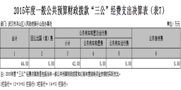 2015年度“三公”经费财政拨款年度预算数为 44 万元,支出决算为44 万元,为预算的 100 %,其中: