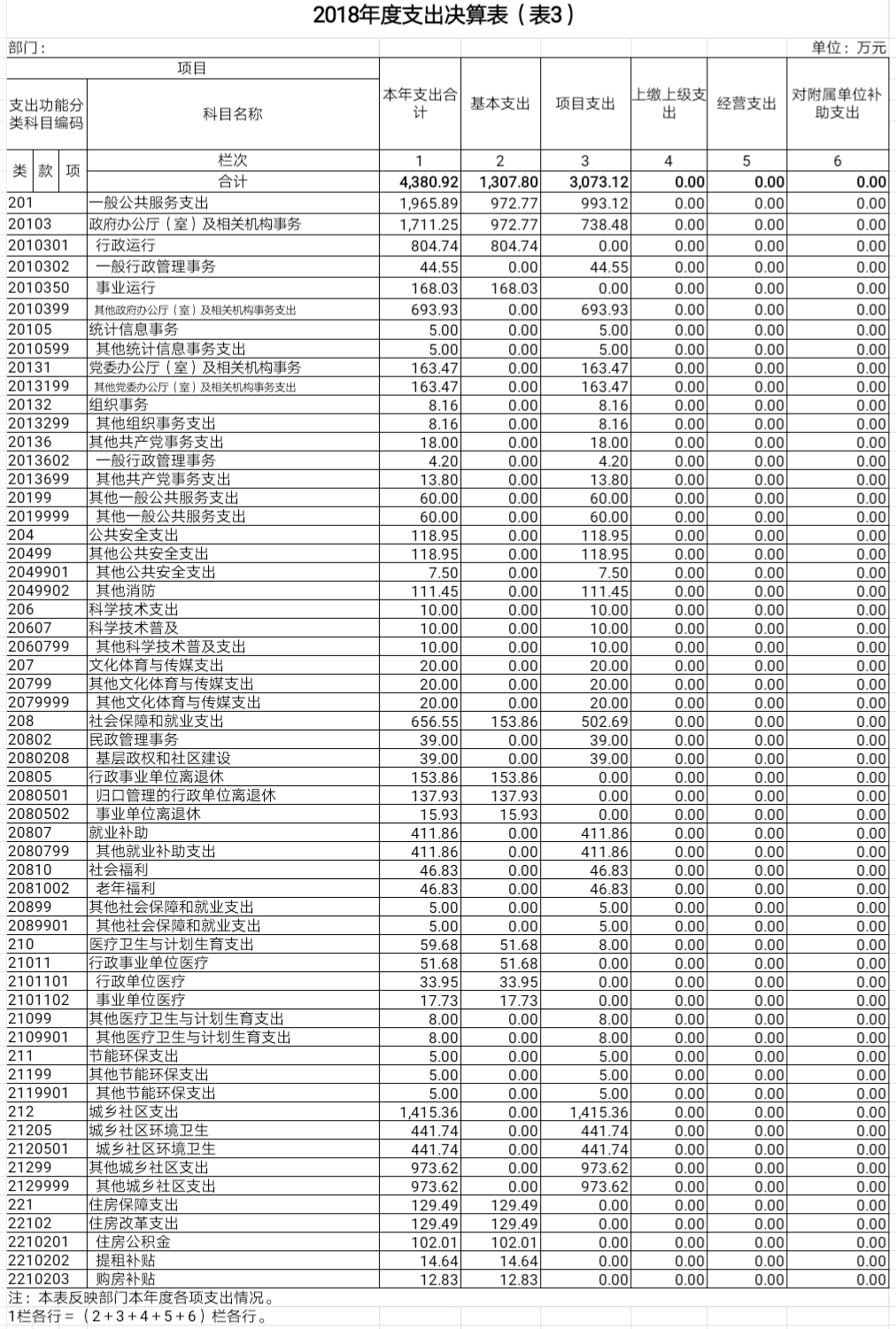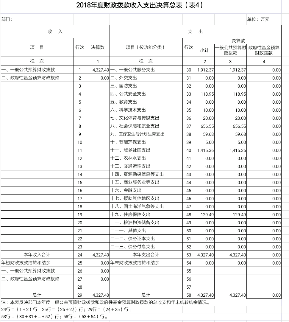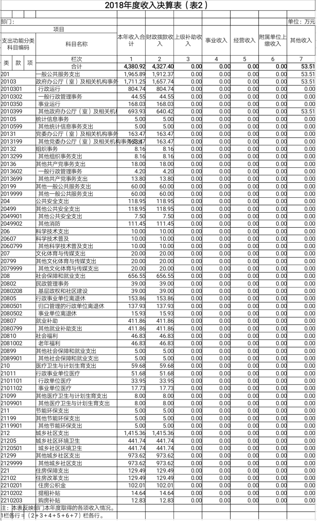 2018年度收、支总计 4380.92 万元。与2017年相比,收、支总计各增加 220.92 万元,增长 5.31%,主要原因是一般公共服务收入减少59.11万元、国防支出收入减少4万元、公共安全支出收入减少18.05万元、科学技术支出收入增加10万元、文化体育与传媒支出减少10万元、社会保障和就业支出收入增加99.55万元、医疗卫生与计划生育支出收入增加6.68万元、节能环保支出减少10万元、城乡社区支出收入增加206.36万元、商业服务业等支出收入减少3万元、住房保障支出收入增加40.49万元、其他支出收入减少38万元。