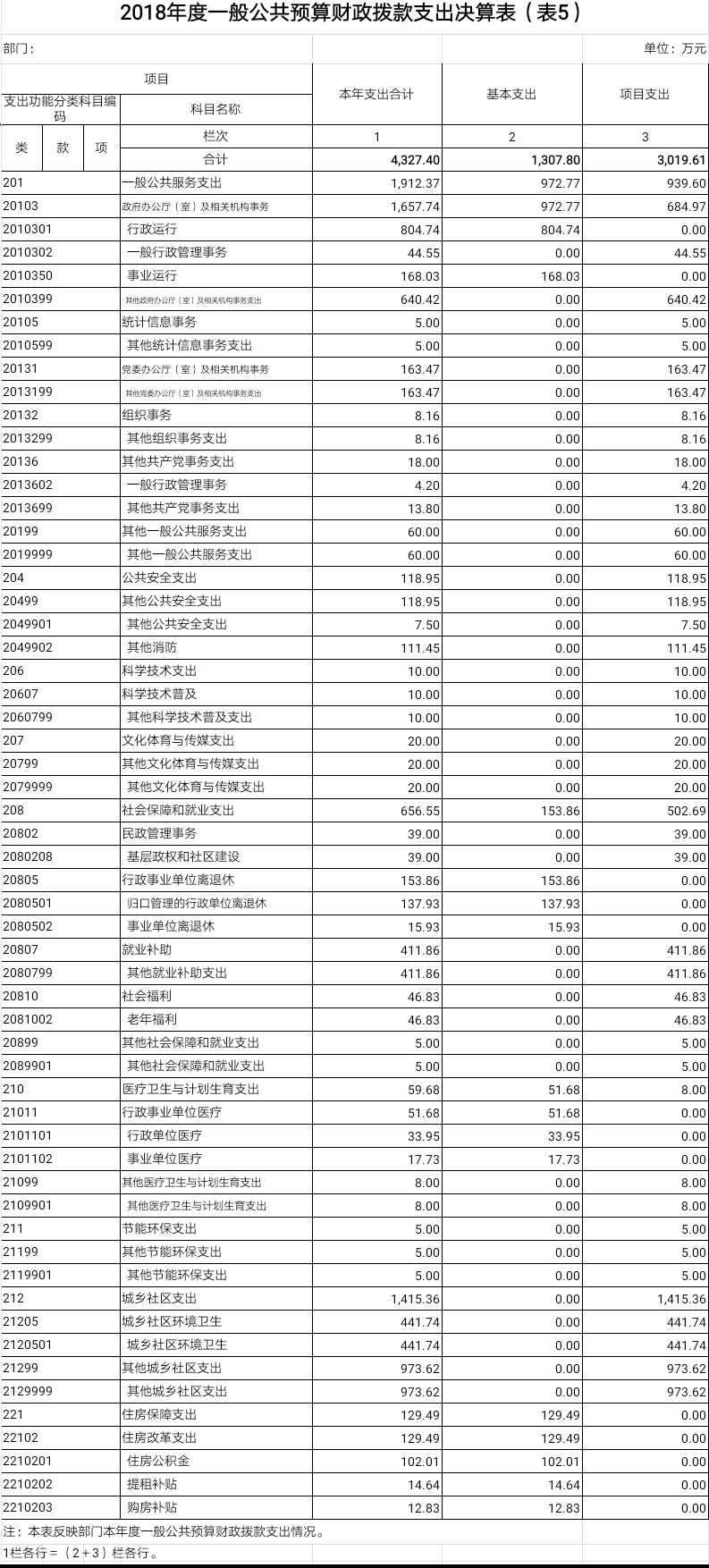 2018年度财政拨款支出 4327.40 万元,主要用于以下方面:一般公共服务(类)支出 1912.37 万元,占 44.19 %;国防支出 0 万元,占 0 %;公共安全支出 118.95 万元,占 2.75 %;教育支出 0 万元,占 0 %;科学技术支出 10 万元,占 0.23 %;文化体育与传媒支出 20 万元,占 0.46 %;社会保障和就业支出 656.55 万元,占 15.17 %;医疗卫生与计划生育支出 59.68 万元,占 1.38 %;节能环保支出 5 万元,占 0.12 %;城乡社区支出 1415.36 万元,占 32.71%;农林水支出 0 万元,占 0 %;交通运输支出 0 万元,占 0%;资源勘探信息等支出 0 万元,占 0 %;商业服务业等支出 0 万元,占 0 %;援助其他地区支出 0 万元,占 0 %;国土海洋气象等支出 0 万元,占 0%;住房保障支出 129.49 万元,占 2.99 %;粮油物资储备支出 0 万元,占 0 %;其他支出 0 万元,占 0 %;债务付息支出 0 万元,占 0 %。