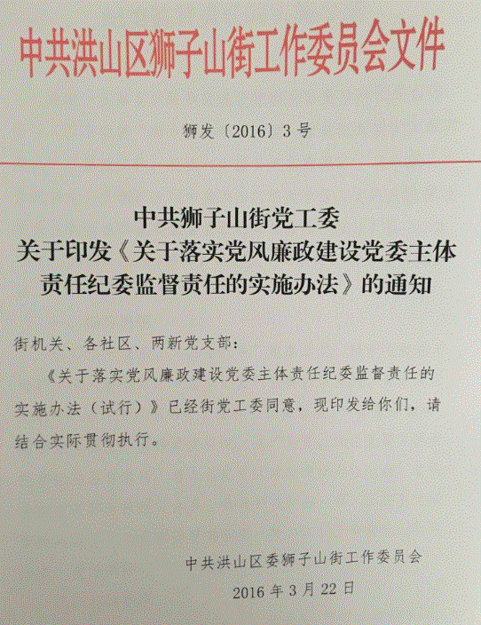 名 称:中共狮子山街党工委关于印发《关于落实党风廉政建设党委主体责任纪委监督责任的实施办法》的通知