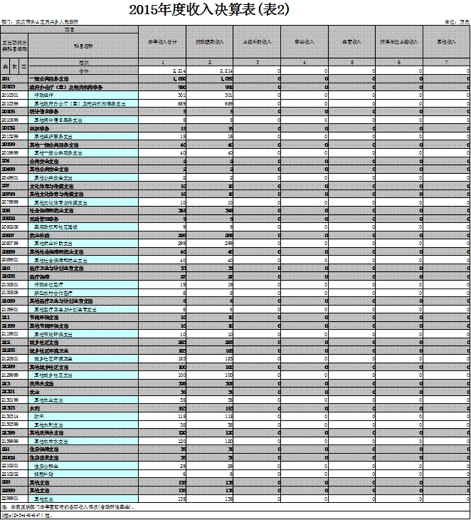 2015年度收入总计2,214万元,支出总计2,214万元。与2014年相比,收入增加847,增长61.96%,主要原因是一般公共服务支出、社会保障就业支出等项目资金的增加以及公共安全支出、节能环保支出等项目的新增。支出增加847,增长61.96%,主要原因是一般公共服务支出、社会保障就业支出等项目资金的增加及公共安全支     出、节能环保支出等项目的新增。