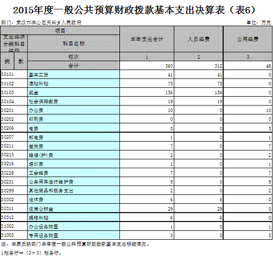2015度一般公共预算财政拨款基本支出360万元,其中,人员经费312万元,主要包括:基本工资、津贴补贴、奖金、社会保障缴费、绩效工资、其他工资福利支出、离休费、退休费、抚恤金、退职(役)费、抚恤金、生活补助、救济费、医疗费、助学金、奖励金、生产补贴、住房公积金、提租补贴、购房补贴、其他对个人和家庭的补助支出;公用经费48万元,主要包括:办公费、印刷费、咨询费、手续费、水费、电费、邮电费、取暖费、物业管理费、差旅费、因公出国(境)费、维修(护)费、租赁费、会议费、培训费、公务接待费、专用材料费、被装购置费、专用燃料费、劳务费、委托业务费、工会经费、福利费、公务用车运行维护费、其他交通费用、税金及附加费用、其他商品和服务支出;基本建设和其他资本性支出40万元,主要包括:房屋建筑构建费、办公设备购置、专用设备购置、基础设施建设、大型修缮、信息网络及软件购置更新、物资储备、土地补偿、安置补助、地上附着物和青苗补助、拆迁补偿、公务用车购置、其他交通工具购置、其他基本建设和资本性支出;对企事业单位的补贴万元,主要包括:企业政策性补贴、事业单位补贴、财政贴息、其他对企事业单位的补贴;债务利息和其他支出万元,主要包括:国内债务付息、国外债务付息、赠与。