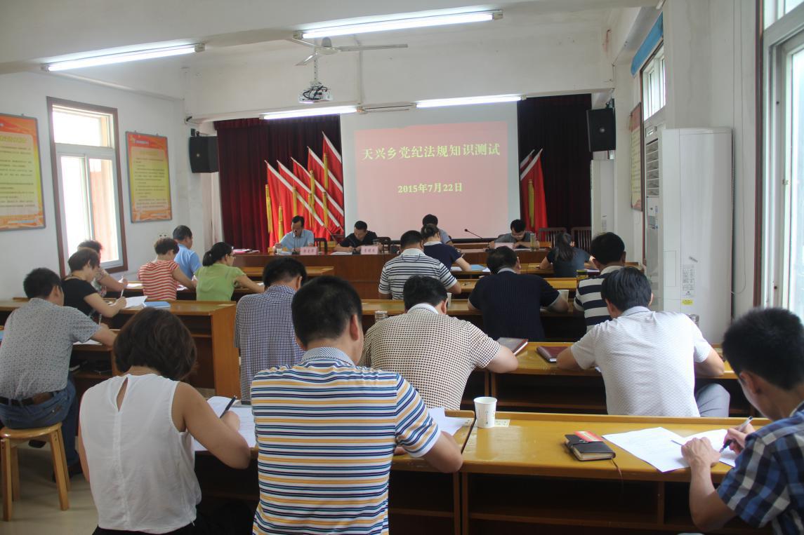 2015年7月22日,由天兴乡纪委书记主持,在天兴乡一楼大会议室,组织实施了“天兴乡党纪法规知识测试活动”。乡领导班子成员、乡各站、办负责人、党支部书记,共计31人参加,测试现场严肃认真,参加测试人员守纪律、讲规矩,乡主要领导现场监督,确保了此次党纪法规知识测试活动顺利完成。