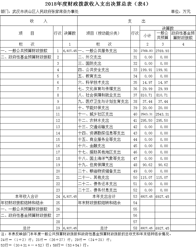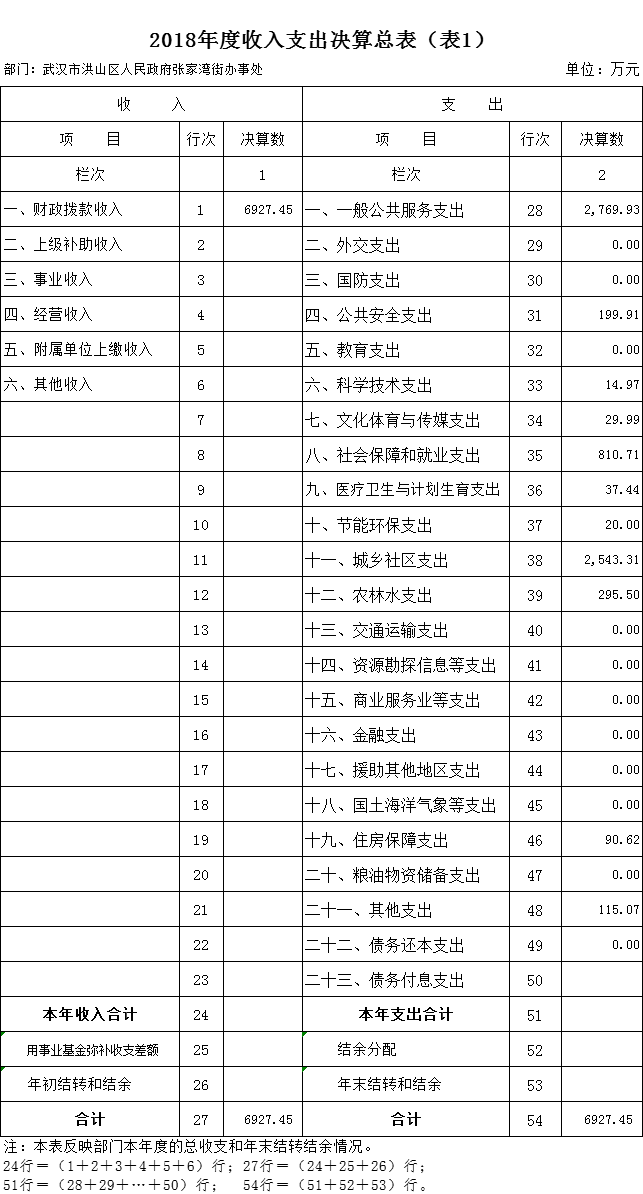 2018年度收、支总计 6927.45万元。与2017年相比,收、支总计各增加430.45万元,增长 6.63%,主要原因是人员支出调整,养老保险与职业年金缴纳调标增加,军运会保障线路沿线环境综合整治等项目支出增加。