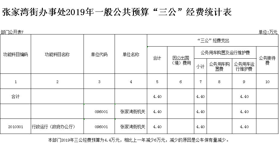 一般公共预算财政拨款安排“三公”经费预算4.4万元,比2018年预算减少6万元,下降57.69 %。其中: