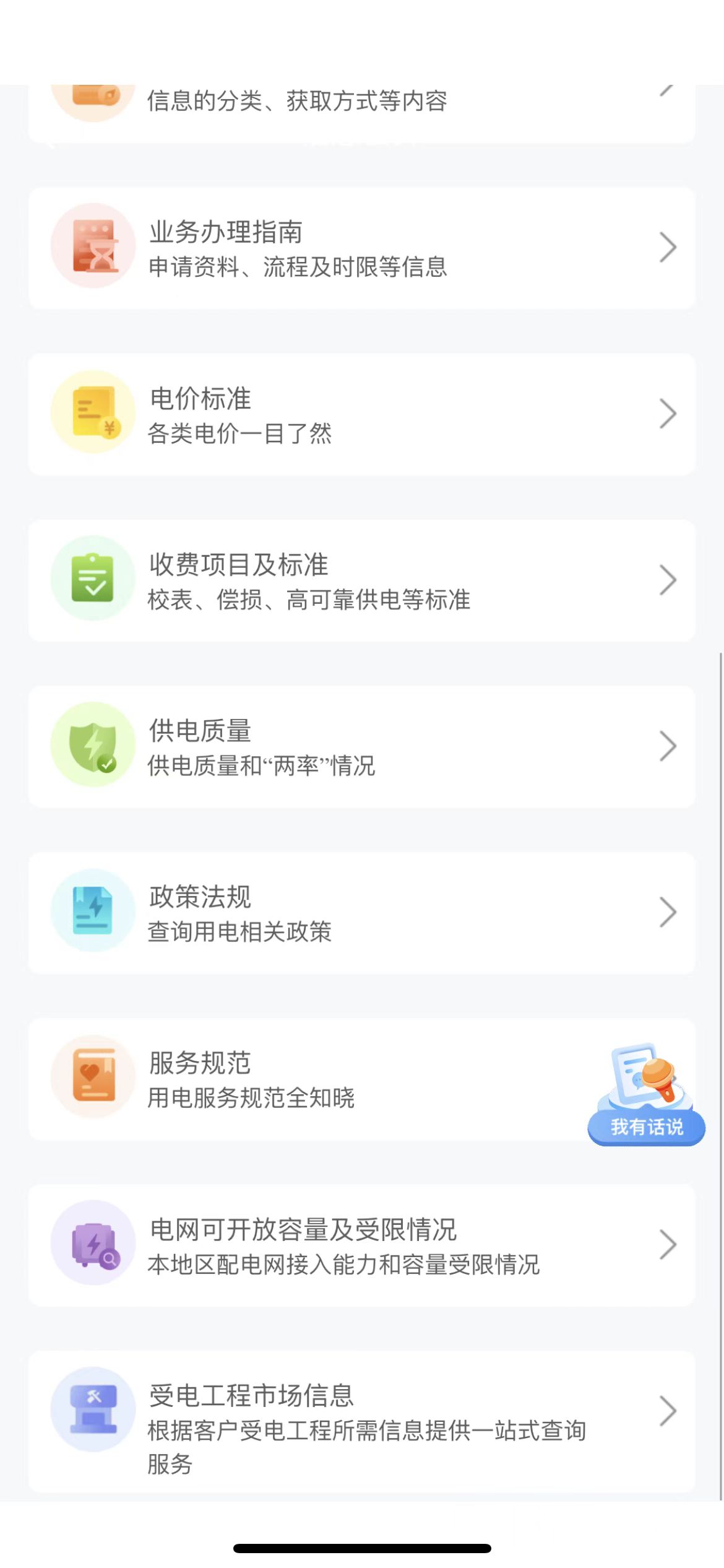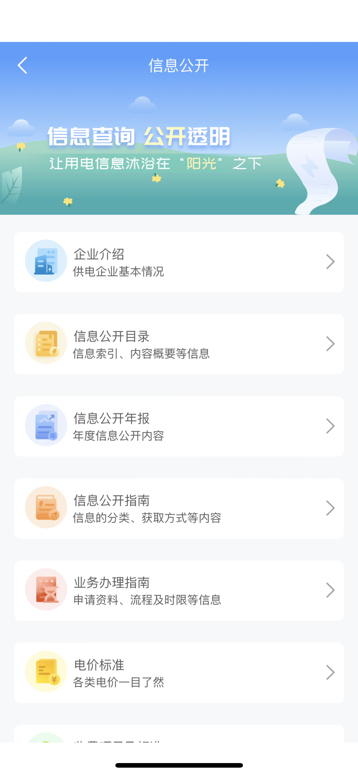 公开信息:企业介绍、信息公开目录、信息公开指南、业务办理指南、电价标准、收费项目及标准、供电质量、政策法规、服务规范、电网可开放容量及受限情况、受电工程市场信息等。