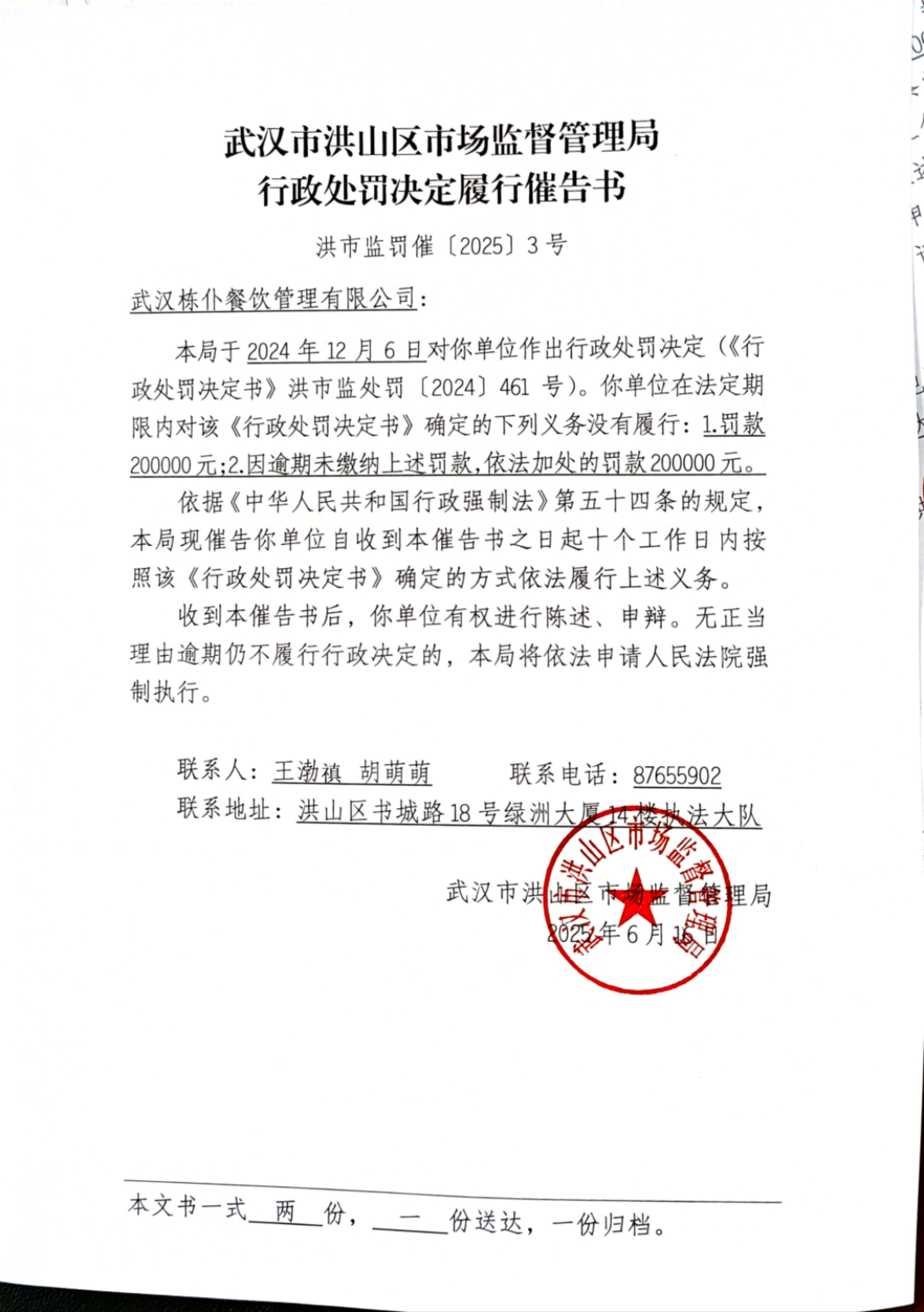 本局于2025年6月16日依法对你单位作出《行政处罚履行决定催告书》(洪市监罚催〔2025〕3号),因采取其他方式无法送达,依据《市场监督管理行政处罚程序规定》第八十二条第五项的规定,本局决定依法向你单位公告送达,内容是:你单位在法定期限内没有履行对《行政处罚决定书》(洪市监处罚〔2024〕461号)确定的下列义务:1.罚款200000元;2.因逾期未缴纳上述罚款,依法加处的罚款200000元。