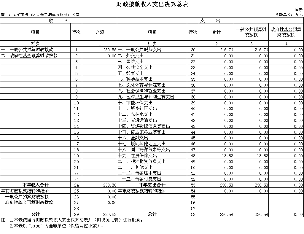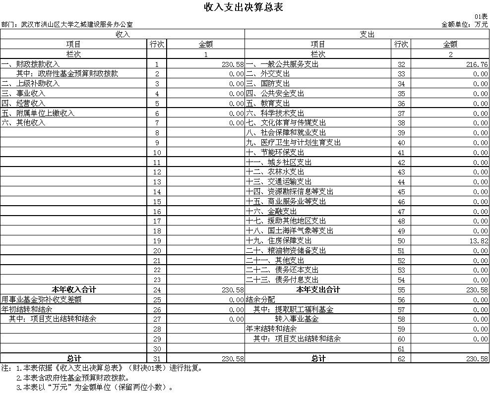 2018年度收、支总计230.58万元。与2017年相比,收、支总计各增加210.58万元,增长(降低)1053%,主要原因是人员编制配备齐全,单位正常运作。