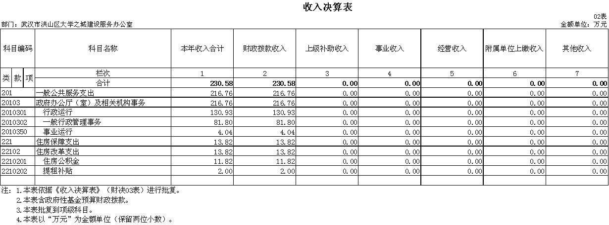 2018年度本年收入合计230.58万元。其中:财政拨款收入230.58万元,占本年收入100%;上级补助收入0万元,占本年收入0%;事业收入0万元,占本年收入0%;经营收入0万元,占本年收入0%;附属单位上缴收入0万元,占本年收入0%;其他收入0万元,占本年收入0%。