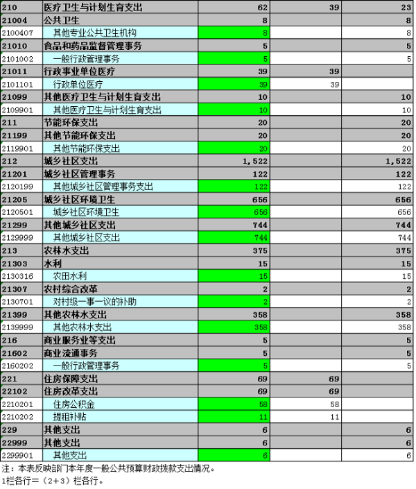 2017年度财政拨款支出5,233万元,主要用于以下方面:一般公共服务(类)支出2,069万元,占39.54 %;国防支出7万元,占0.13 %;公共安全支出107万元,占2.04 %;教育支出0万元,占0 %;科学技术支出0万元,占0 %;文化体育与传媒支出40万元,占0.76 %;社会保障和就业支出951万元,占18.17 %;医疗卫生与计划生育支出62万元,占1.18 %;节能环保支出20万元,占0.38 %;城乡社区支出1,522万元,占0.56 %;农林水支出375万元,占7.17 %;交通运输支出0万元,占0 %;资源勘探信息等支出0万元,占0 %;商业服务业等支出5万元,占0.10 %;援助其他地区支出0万元,占0 %;国土海洋气象等支出0万元,占0 %;住房保障支出69万元,占1.32 %;粮油物资储备支出0万元,占0 %;其他支出6万元,占0.11 %;债务付息支出0万元,占0 %