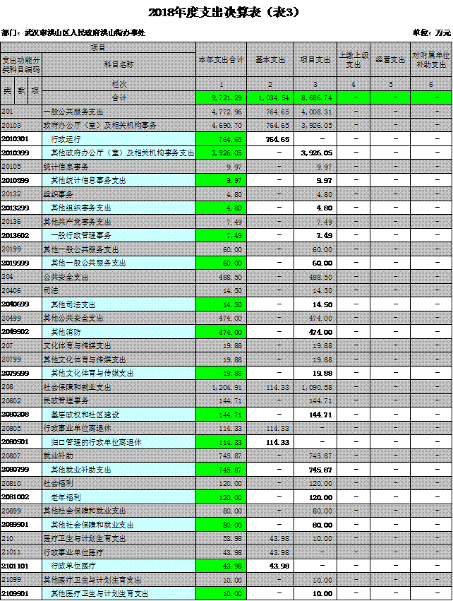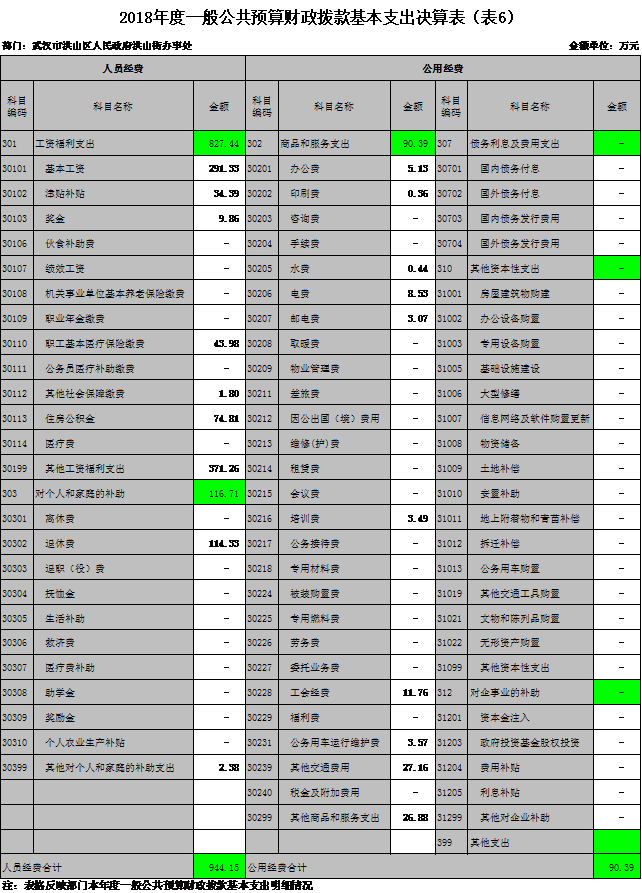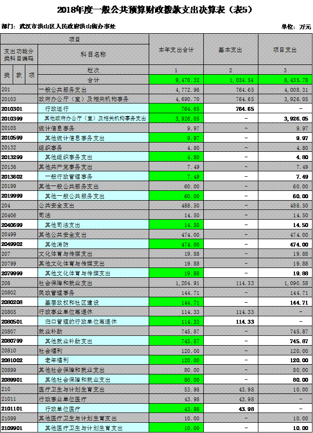 1.2018年一般公共预算财政拨款支出年初预算为 8,854.79万元支出决算为 9,470.32万元,完成年初预算的 106.95%。其中:基本支出 1,034.54万元,项目支出8,435.78万元。项目支出主要用于:南湖雅园泵站电费8万元,主要成效为解决渍水问题;其他人员(文贤舫)10.6万元,主要成效为人员经费;设备购置26.54万元,主要成效为解决机关各办公室办公需要;应急专项经费500万元,主要成效为应对并即时解决突发事件,维护一方平安;各部门经费120万元,主要成效为人大、党政、政协、党建、组织、纪委、统战、宣传、妇联及团工委经费;工会经费36.99万元,主要成效为解决街职工会员的合法福利和文体活动等所需费用;关工委工作经费4万元,主要成效为关工委主任劳务费、主题活动及五老慰问经费;街食品安全工作经费8.95万元,主要成效为人员经费;税收服务站人员经费31.5万元,主要成效为人员经费;服务企业工作经费20万元,主要成效为完成区商务旅游局下达的招商引资目标任务,要开展外出招商及推介等活动;精准扶贫工作经费3万元,主要成效为扶贫资金;武装部专项经费10万元,主要成效为履行武装部工作职能征兵、防汛、民兵整组;企业改制遗留问题专项7万元,主要成效为解决1位残疾人和1为非残疾人的改制补偿金;劳动保障专项经费6万元,主要成效为劳动就业培训工作经费;临时人员47.01万元,主要成效为临时人员经费;社区网格化人员工资33万元,主要成效为工资经费;安全生产经费含消费经费60万元,主要成效为解决消防演练及老旧社区消防安全隐患问题;食药监所经费10万元,主要成效为创建标准所示范所的硬件改造及添加办公设备费用;后勤保障经费补助30.9万元,主要成效为后勤保障经费补助;机关大楼运行维护费69.8万元,主要成效为机关大楼租金、水费、电费等费用;后勤经费125.04万元,主要成效为机关工作人员就餐经费;物业管理费37万元,主要成效为物业管理费、停车费、机关大楼保安保洁劳务费;板桥新村小区道路刷黑围墙改造131.17万元,主要成效为丰富板桥新村小区居民生活,美化小区环境;三资清查审计费28万元,主要成效为14个村审计费;信访维稳经费300万元,主要成效为包保稳控费用及集中解决群众诉求工作费用;街治安巡逻员经费62.4万元,主要成效为街治安巡逻员工资;政务服务中心运营相关20.2万元,主要成效为配置相关硬件系统,更好服务群众;汤逊湖村湖泊禁养补助及安置1497.01万元,主要成效为彻底解决渔民上案的生存发展,保障社会稳定和谐发展;资产转让税费(洪山街)21.73万元;汤逊湖边餐馆拆除环境整治58万元;南湖法庭项目经费87.22万元;街道办事处财源建设资金(经济普查)90万元;街道办事处财源建设资金(道路维修、环境整治)18万元;街道办事处财源建设资金(18年部门预算追加项目)380万元;调整街道税务服务站协税人员薪资待遇27万元;统计工作经费9.97万元,主要成效为支持国家大型普查工作,保障普查人员及普查单位的各项费用,确保经济普查工作顺利完成;两新组织退休党建指导员工作津贴4.8万元;机关工委网格员通信费补贴7.49万元;文明创建经费60万元,主要成效为文明创建宣传、巡查及工作经费等;街乡普法经费5万元,主要成效为配备一名专职调解员在各村、社区开展人民调解工作;聘请法律顾问费5万元,主要成效为健全防范和化解社会矛盾纠纷;人民调解员工资4.5万元,主要成效为工资经费;街乡人民调解委员会工作经费1万元,主要成效为开展工作经费;平安社区服务中心建设费30万元;社区法务工作室经费11万元,主要成效为工作经费;综治经费432万元,主要成效为平安创建监防安装及改造、创建洪山法庭租房、平安创建财务审计、打击非法传销、网格信息化建设(含运维);文体专项补助经费19.88万元,主要成效为丰富辖区居民的文化生活、规范网吧建设和管理;社区村管理工作经费144.71万元,主要成效为解决社区租房、装修等以及不能成立社区的小区的居民的各种问题;社区安保队员流动人口和出租屋协管员工资617.87万元,主要成效为人员经费;长期劳务人员128万元,主要成效为长期劳务人员工资及津贴补贴、奖金等;社会福利事业120万元;民政优抚专项经费(含扶贫)80万元,主要成效为通过优抚、扶贫,解决辖区内群众的实际困难;卫生计生专项经费10万元,主要成效为增强卫生意识、改善卫生环境、倡导健康生活方式、减少健康危害因素、提高公民健康水平;环保经费20万元,主要成效为解决环保方面问题;城管下沉专项经费630.5万元,主要成效为洪山街执法一、二中队城管协管员的体检、意外伤害险、高温补助、制式服装经费、工资及加班费;“门前三包“经费179.91万元,主要成效为人员经费(含工资、五险单位部分、高温补贴、意外险、伙食费、体检、加班费);道路清扫保洁经费656.39万元,主要成效为解决道路清扫保洁的问题;老旧小区、村(湾)垃圾清运费168万元,主要成效为解决老旧社区、村(湾)垃圾清运问题;城市排滞经费15万元,主要成效为解决社区、村渍水问题;大城管专项补助经费791.7万元,主要成效为渣土管理安保、道路维修经费、金秋菊花展览、城中村环境整治费、地埋站管理维护、中队拆违经费、铁路沿线整治及巡查办公费等;“三旧”改造工作经费20万元,主要成效为促进我街2017年内末正在启动及2018年新增的“三旧”改造项目;农业水利经费20万元,主要成效为