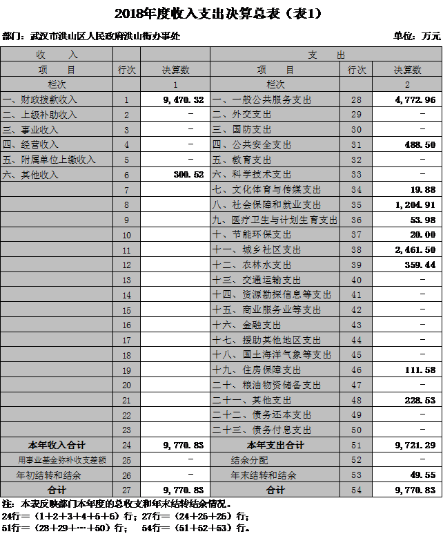 2018年度收入合计 9,770.83万元,2018年度支出合计 9721.29万元。与2017年相比,收入增加 2,621.86万元,增长 36.67%;支出增加 2572.32万元,增长 35.98%。主要原因是基本支出中在职人员养老保险费、职业年金缴费增长;项目支出中公共安全支出增加,城管执法力量下沉及汤逊湖村湖泊禁养安置经费、板桥新村小区道路刷黑围墙改造经费列入部门预算等。