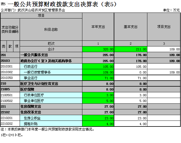 武汉洪山经济开发区管理委员会2014年一般公共预算财政拨款支出年度预算为279万元(包括年初部门预算、基本建设等专项资金、上级下达的专项转移支付资金及年初结转和结余资金等支出),支出决算为320万元,完成年度预算的114.7%。其中:基本支出211万元,项目支出109万元。项目支出项目有:(1)园区招商协调经费项目20万元。用于园区招商宣传、招商协调活动组织等工作费用。(2)园区安保队工资补助房租水电费项目 15万元。园区安保人员工资、房租、水电等经费。(3)企业党建群团经费项目 2万元。和企业开展党建群团活动经费。(4)创意产业办公经费项目64万元。南湖创意产业办公宣传、环境设施工作经费。(5)机动经费项目8万元。用于项目经费的补充和临时性突发活动的开支等。