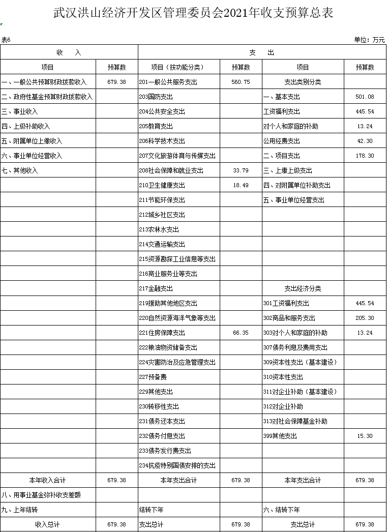 名 称:武汉洪山经济开发区管理委员会2021年收支预算总表