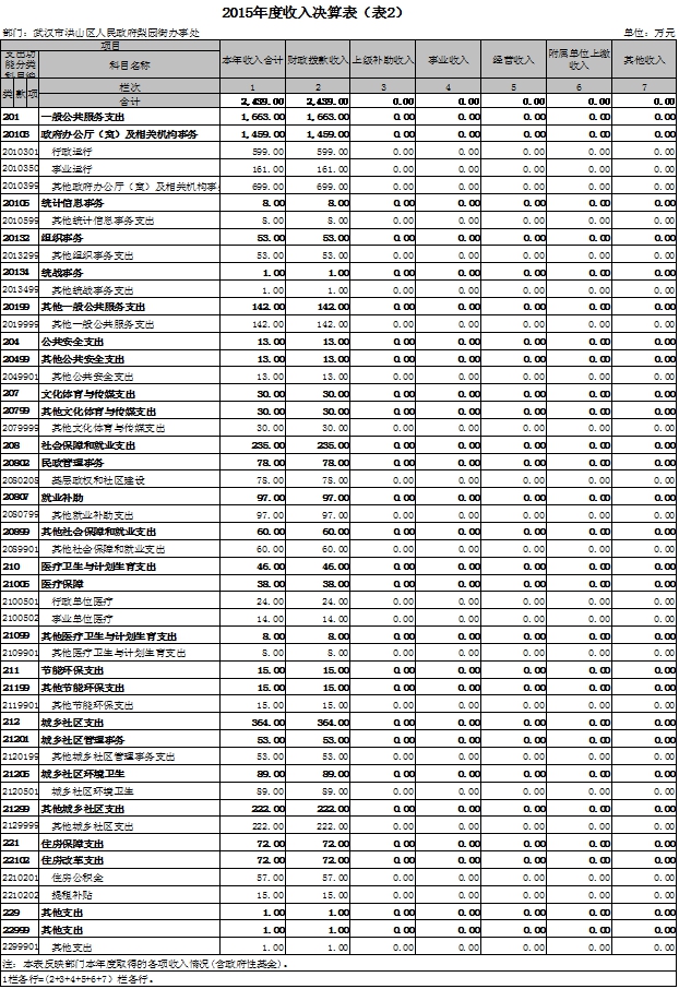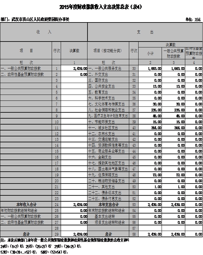 2015年度收入总计2,439万元,支出总计2,439万元。与2014年相比,收入减少183万元,降低7%。支出减少183万元,降低7%,主要原因是办公设备购置费、办公经费、公务接待费等减少。