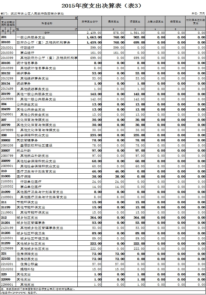 2015年一般公共预算财政拨款支出年度预算为2,666万元(包括年初部门预算、基本建设等专项资金、上级下达的专项转移支付资金及年初结转和结余资金等支出),支出决算为2,439万元,完成年度预算的92%。其中:基本支出878万元,项目支出1,561万元。项目支出主要用于一般公共服务支出903万元,主要用于政府办公厅及相关机构事务;公共安全支出13万元,主要用于维护社会的公共安全各秩序,加大安全意识宣传,健全体制,明确责任;文化体育与传媒支出30万元,主要用于文化体育建设、体育设备购置、社区文化娱乐服务;社会保障和就业支出235万元,主要用于慰问孤寡老人,社会保险基金补助支出,为保证无收入、低收入家庭提供生活保障;节能环保支出15万元,主要用于修筑节能灯具;城乡社区支出364万元,主要用于道路维修,构建公共设施,环境卫生宣传,社区环境卫生调研工作,深入开展除“四害”,改善社区环境,提高居民生活质量工作;其他支出1万元。