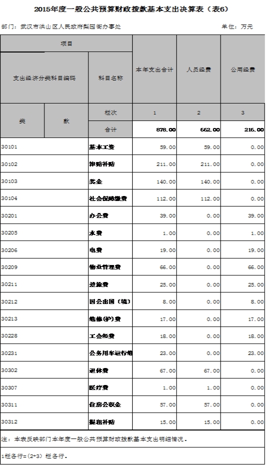 2015度一般公共预算财政拨款基本支出878万元,其中,人员经费662万元,主要包括:基本工资、津贴补贴、奖金、社会保障缴费、绩效工资、其他工资福利支出、离休费、退休费、抚恤金、退职(役)费、抚恤金、生活补助、救济费、医疗费、助学金、奖励金、生产补贴、住房公积金、提租补贴、购房补贴、其他对个人和家庭的补助支出;公用经费216万元,主要包括:办公费、印刷费、咨询费、手续费、水费、电费、邮电费、取暖费、物业管理费、差旅费、因公出国(境)费、维修(护)费、租赁费、会议费、培训费、公务接待费、专用材料费、被装购置费、专用燃料费、劳务费、委托业务费、工会经费、福利费、公务用车运行维护费、其他交通费用、税金及附加费用、其他商品和服务支出;基本建设和其他资本性支出23万元,主要包括:房屋建筑构建费、办公设备购置、专用设备购置、基础设施建设、大型修缮、信息网络及软件购置更新、物资储备、土地补偿、安置补助、地上附着物和青苗补助、undefined补偿、公务用车购置、其他交通工具购置、其他基本建设和资本性支出。