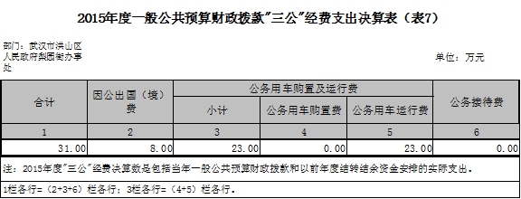 2015年度“三公”经费财政拨款年度预算为 31 万元,支出决算为31万元,完成预算的 100 %。其中: