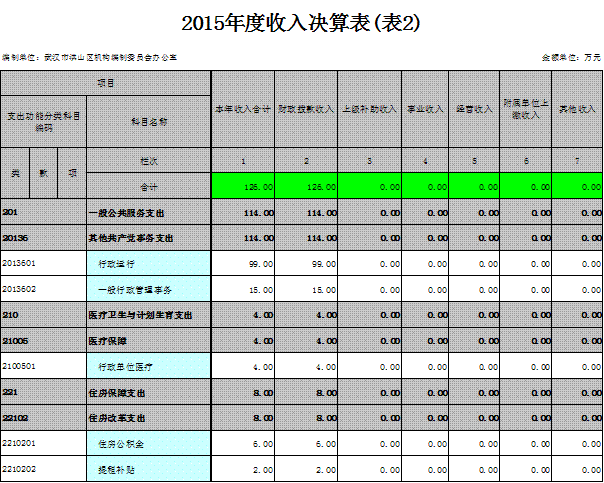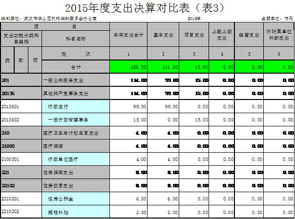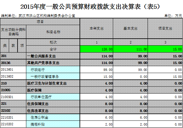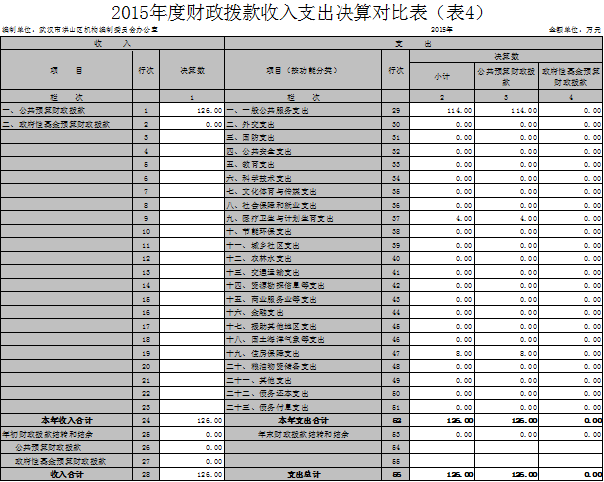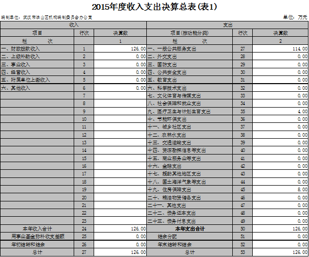 2015年度收入总计126万元,支出总计126万元。与2014年相比,收入增加22万元,增长21%,主要原因是一般公共服务额。支出增加22万元,增长21%,主要原因是一般公共服务增加。