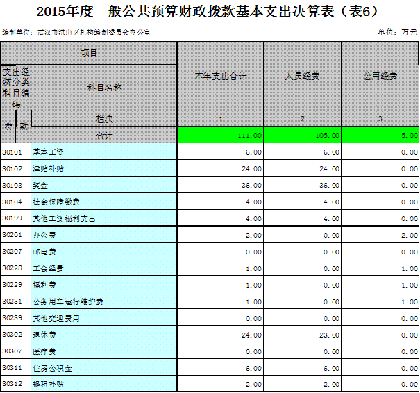 2015度一般公共预算财政拨款基本支出111万元,其中,人员经费105万元,主要包括:基本工资、津贴补贴、奖金、社会保障缴费、绩效工资、其他工资福利支出、离休费、退休费、抚恤金、退职(役)费、抚恤金、生活补助、救济费、医疗费、助学金、奖励金、生产补贴、住房公积金、提租补贴、购房补贴、其他对个人和家庭的补助支出;公用经费5万元,主要包括:办公费、印刷费、咨询费、手续费、水费、电费、邮电费、取暖费、物业管理费、差旅费、因公出国(境)费、维修(护)费、租赁费、会议费、培训费、公务接待费、专用材料费、被装购置费、专用燃料费、劳务费、委托业务费、工会经费、福利费、公务用车运行维护费、其他交通费用、税金及附加费用、其他商品和服务支出;基本建设和其他资本性支出1万元,主要包括:房屋建筑构建费、办公设备购置、专用设备购置、基础设施建设、大型修缮、信息网络及软件购置更新、物资储备、土地补偿、安置补助、地上附着物和青苗补助、拆迁补偿、公务用车购置、其他交通工具购置、其他基本建设和资本性支出。
