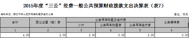2015年度“三公”经费财政拨款年度预算为10.8万元,支出决算为4万元,完成预算的37%。其中: