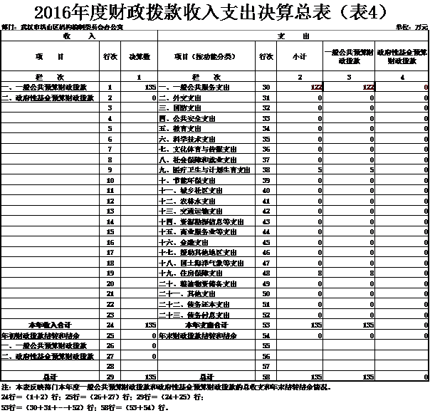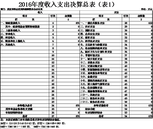 2016年度收入总计135万元,支出总计135万元。与2015年相比,收、支总计各增加9万元,增长7.1%,主要原因是一般公共服务增加。