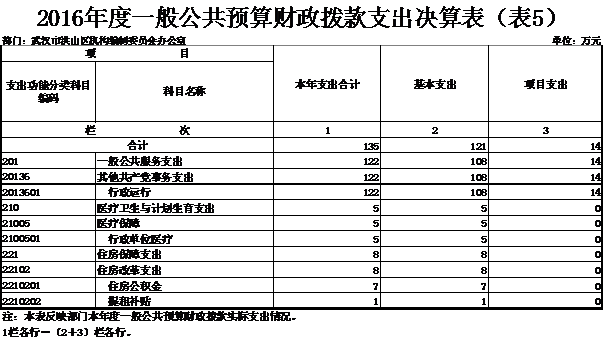 2016年一般公共预算财政拨款支出年度预算为163万元(包括年初部门预算、基本建设等专项资金、上级下达的专项转移支付资金及年初结转和结余资金等),支出决算为135万元,完成年度预算的83%。其中:基本支出121万元,项目支出14万元。项目支出主要用于机构编制监督检查及统计工作经费4万元,主要成效用于机构编制监督检查及统计工作;全区机构编制核查数据库维护和机构绩效管理考核工作经费4万元,主要成效用于全区机构编制核查数据库维护和机构绩效管理考核工作;编委会会议经费0.5万元,主要成效用于全年多次编委会会议材料印制;设备购置1.1万元,主要成效用于办公设备购置;党建工作经费0.3万元,主要成效用于党建工作;行政审批、行政权力清理及政务服务工作经费4.1万元,主要成效用于行政审批、行政权力清理及政务服务工作。