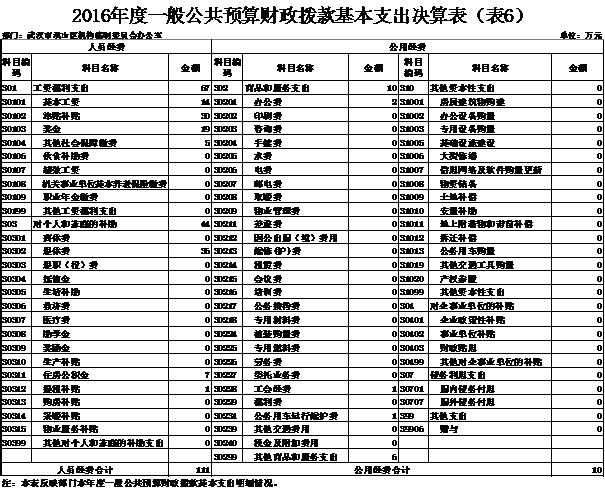 2016度一般公共预算财政拨款基本支出121万元,其中,人员经费111万元,主要包括:基本工资、津贴补贴、奖金、其他社会保障缴费、绩效工资、机关事业单位基本养老保险缴费、职业年金缴费、其他工资福利支出、离休费、退休费、退职(役)费、抚恤金、生活补助、救济费、医疗费、助学金、奖励金、住房公积金、提租补贴、购房补贴、物业服务补贴、其他对个人和家庭的补助支出;公用经费10万元,主要包括:办公费、印刷费、咨询费、手续费、水费、电费、邮电费、取暖费、物业管理费、差旅费、因公出国(境)费、维修(护)费、租赁费、会议费、培训费、公务接待费、专用材料费、专用燃料费、劳务费、委托业务费、工会经费、福利费、公务用车运行维护费、其他交通费用、税金及附加费用、其他商品和服务支出、办公设备购置、专用设备购置、信息网络及软件购置更新、公务用车购置、其他交通工具购置、其他资本性支出、企业政策性补贴、事业单位补贴、其他对企事业单位的补贴。