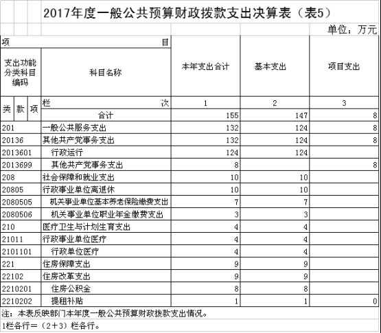2017年度本年支出合计155万元。其中:基本支出147万元,占本年支出94.84%;项目支出8万元,占本年支出5.16%。