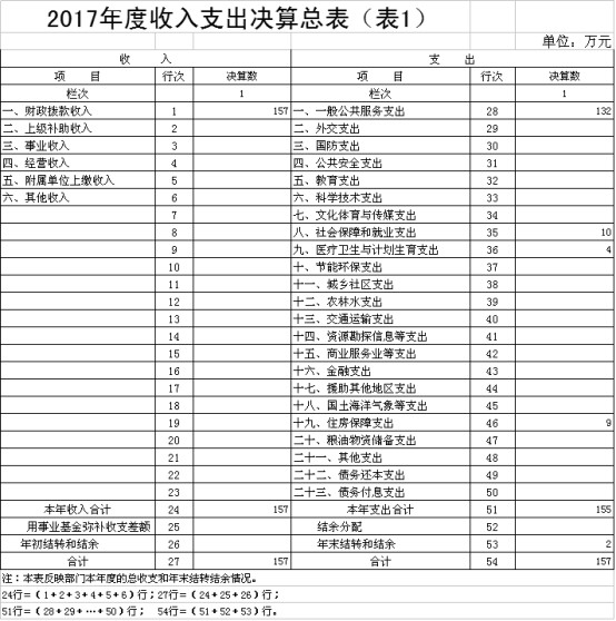 2017年度收、支总计157万元。与2016年相比,收、支总计各增加22万元,增长16.30%,主要原因是社会保障和就业支出增加。