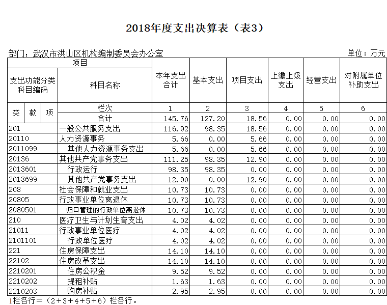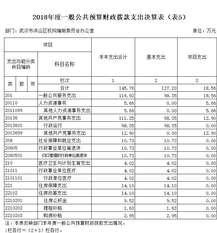 2018年一般公共预算财政拨款支出年初预算为177.45万元,支出决算为145.76万元,完成年初预算的82.14%。其中:基本支出127.20万元,项目支出18.56万元。项目支出主要用于党建工作经费(含纪检)0.46万元,用于党建专项工作;购买服务支出2.10万元,用于购买法律、代理记账等服务;全区机构编制干部培训费0.50万元,用于全区机构编制干部培训工作;全区事业单位法人登记和编制文书档案整理工作及全区统一社会信用代码2.98万元,用于全区事业单位法人登记和编制文书档案整理工作及全区统一信用代码工作;全市委编办主任联席会议经费1.00万元,用于全市委编办主任联席会议工作;事业单位分类改革和“放管服”改革工作经费3.58万元,用于事业单位分类改革和“放管服”改革工作;文明创建工作经费0.50万元,用于文明创建工作;办公桌椅、设备购置及档案的修葺5.66万元,用于更新办公设备;办公设备购置0.60万元,用于更新办公设备;后勤保障经费补助1.18万元,用于后勤保障工作。