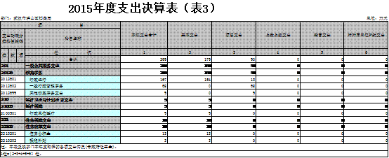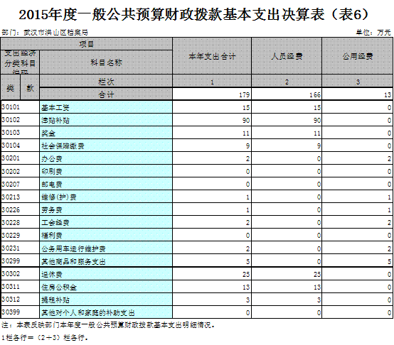 2015度一般公共预算财政拨款基本支出179万元,其中,人员经费166万元,主要包括:基本工资、津贴补贴、奖金、社会保障缴费、绩效工资、其他工资福利支出、离休费、退休费、抚恤金、退职(役)费、抚恤金、生活补助、救济费、医疗费、助学金、奖励金、生产补贴、住房公积金、提租补贴、购房补贴、其他对个人和家庭的补助支出;公用经费13万元,主要包括:办公费、印刷费、咨询费、手续费、水费、电费、邮电费、取暖费、物业管理费、差旅费、因公出国(境)费、维修(护)费、租赁费、会议费、培训费、公务接待费、专用材料费、被装购置费、专用燃料费、劳务费、委托业务费、工会经费、福利费、公务用车运行维护费、其他交通费用、税金及附加费用、其他商品和服务支出。