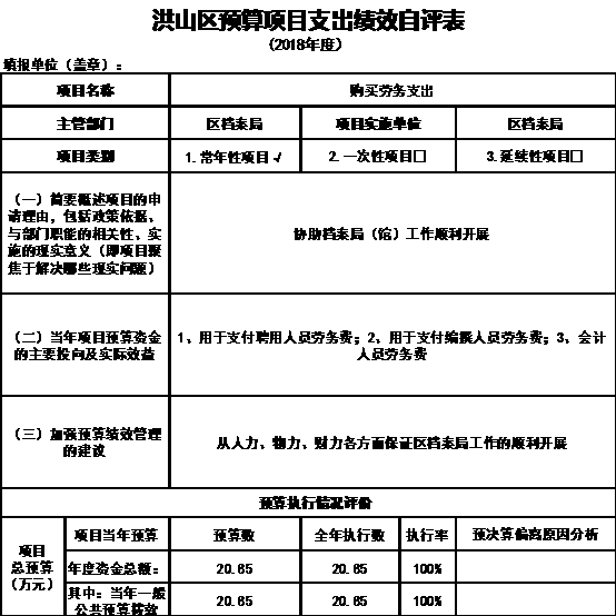 购买劳务支出项目绩效自评综述:项目全年预算数为20.85万元,执行数为1万元,完成预算的100%。主要产出和效果:一是财务代帐服务费,保障的财务记账工作的顺利进行;二是完成下达的编撰任务;三是协助日常档案馆、局办公室工作,从人力物力财力各方面保证区档案局工作的顺利开展。
