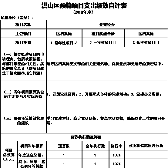 党建经费项目绩效自评综述:项目全年预算数为1万元,执行数为1万元,完成预算的100%。主要产出和效果:一是抓党建工作落实。专题研究党建工作,制定工作计划,认真组织开展“不忘初心、牢记使命”主题教育,落实“三会一课”制度,坚持支部主题党日活动,创新学习模式,4月份和10月份与区委党史办两次联合,组织党员到到蔡甸野战国防园等红色教育基地参观学习,引导和教育党员干部立足档案岗位,牢记使命。二是抓党风廉政建设。局长牧原为全局党员做了“加强党风廉政建设树立档案干部良好形象”的专题党课;深入学习新修订的《宪法》《监察法》等,通过学习讨论、撰写心得体会、测试等形式,使党规党纪学习教育宣传全覆盖。通过播放“反腐倡廉”及廉政公益广告,营造清廉的工作氛围。组织党员干部集中观看及会议通报严重违法违纪案件二次,引导党员干部汲取教训、自觉警醒。