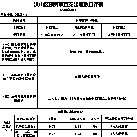 后勤保障(餐费)项目绩效自评综述:项目全年预算数为9.72万元,执行数为8.73万元,完成预算的90%。主要产出和效果:用于日常工作餐,从人力物力财力各方面保证区档案局工作的顺利开展。