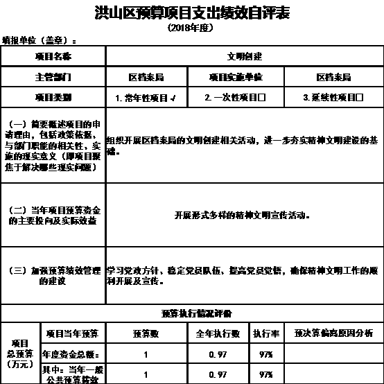 文明创建项目绩效自评综述:项目全年预算数为1万元,执行数为0.97万元,完成预算的97%。主要产出和效果:宣传文明精神活动的开展。