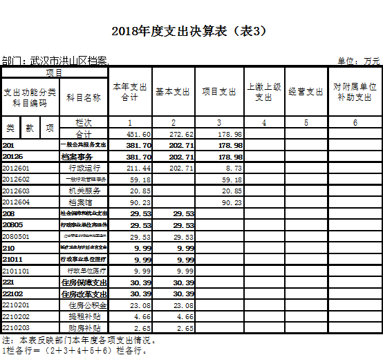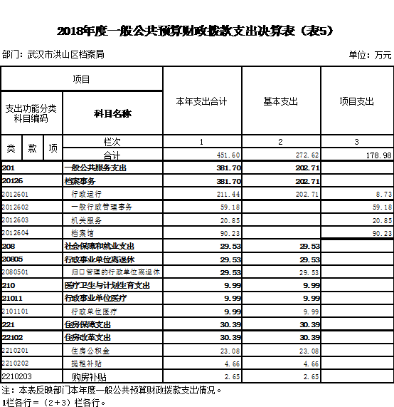 2018年一般公共预算财政拨款支出年度预算为451.6万元(包括年初部门预算、基本建设等专项资金、上级下达的专项转移支付资金及年初结转和结余资金等),支出决算 为451.6万元,完成年度预算的100%。其中:基本支出272.62万元,项目支出178.98万元。项目支出主要用于后勤保障(餐费)8.73万元,主要成效保障工作人员餐费;党建经费1万元,主要成效开展党建活动;后勤保障经费56.2万元,主要成效保障档案馆正常运行;文明创建0.97万元,主要成效开展文明精神宣传活动;聘请法律顾问1万元,主要成效全年关于法律方面咨询与培训;购买劳务支出20.85万元,主要成效支付聘用人员工资;档案工作运行费85.23万元,主要成效档案数字化、数据清洗等;爱国主义教育基地长效管理维护费5万元,主要成效设备维护,展板更换等。