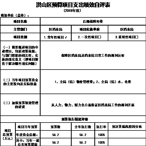 后勤保障经费项目绩效自评综述:项目全年预算数为56.2万元,执行数为56.2万元,完成预算的100%。主要产出和效果:一是保障档案库房正常运行;二是保障全局(馆)安防、消防等设备的正常运行。