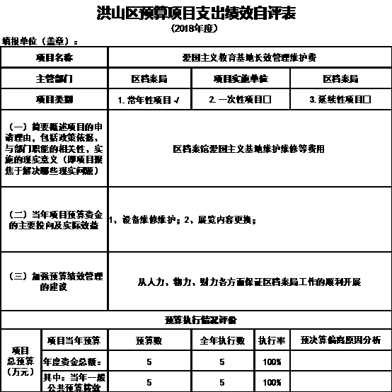 爱国主义教育基地长效管理维护费项目绩效自评综述:项目全年预算数为5万元,执行数为5万元,完成预算的100%。主要产出和效果:一是以改革开放四十周年为主题,对爱国主义教育基地进行了改版,更换展板;二是以“档案见证改革开放”为主题的档案展览,面向社会开放,爱国主义教育基地参观680人次。