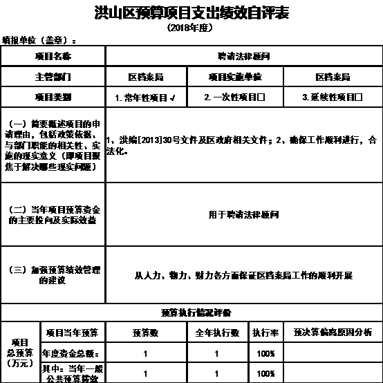 聘请法律顾问项目绩效自评综述:项目全年预算数为1万元,执行数为1万元,完成预算的100%。主要产出和效果:一是制发了2018年度法治工作计划。聘请了法律顾问并签订了合同,制订了“以案释法”“法润民心”“法惠民生”普法活动,聘请法律专家来局解读《新宪法修正案》,征订法制宣传资料(小红的兰台奇遇)200份,档案文化折扇10套。邀请武汉市档案局法规处处长蒋敏华来区委党校给第四期事业单位工作人员培训班讲授《公职人员档案意识与档案行为法制化》,进一步营造全区档案法制宣传氛围。二是加大档案行政执法力度。全年共组织开展了辖区95家单位档案行政执法监督检查,未发现有档案违法违规行为,查处率100%。三是大力开展“七五”普法宣传活动。组织全局人员在“法宣在线”平台学习有关法律法规知识,成立习法课堂领导小组,制定了习法课堂工作实施方案。结合我区平安建设宣传督导和开展扫黑除恶等综合治理工作,开展了送法到基层活动,在本局综治联系对口社区——井岗社区讲授法律法规有关知识。