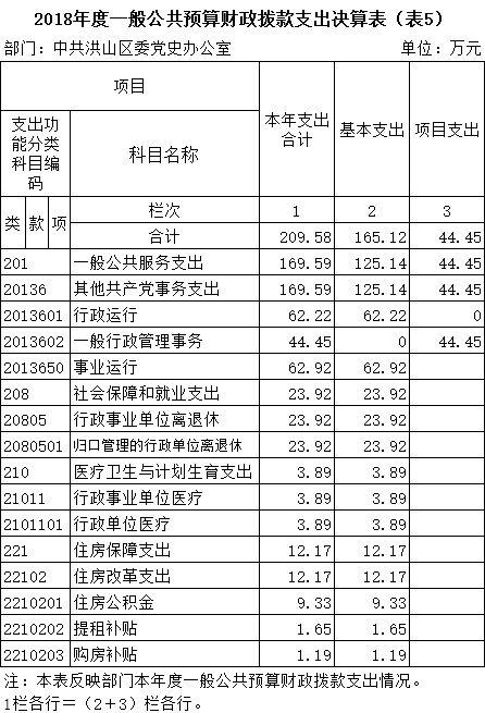 2018年一般公共预算财政拨款支出年初预算为297万元(包括年初部门预算、基本建设等专项资金、上级下达的专项转移支付资金及年初结转和结余资金等),支出决算为210 万元,完成年初预算的70.71%。其中:基本支出165万元,项目支出45万元。项目支出主要用于党建工作经费(含纪检)0.49万元,主要成效开展党建工作;购买劳务支出2.1万元,主要成效:聘请法律顾问及代账会计;后勤保障经费0.74万元,主要成效:单位人员饭卡充值;《洪山山水》15万元,主要成效:资料收集、编辑以及书籍的印刷;党史宣传教育1万元,主要成效:开展党史宣传教育工作;购买办公设备1.5万元,主要成效:购买照相机;《洪山年鉴》(2018卷)与《武汉年鉴》(2018卷)洪山概况数据上报4.97万元,主要成效:资料收集、编辑以及书籍的印刷;《中共洪山历史》(1978-2002)等9.88万元,主要成效:资料收集、编辑以及书籍的印刷;《中国共产党黄色网址 组织史资料第六卷》(2006.12-2011.11)自编本8.78万元,主要成效:资料收集、编辑以及书籍的印刷。