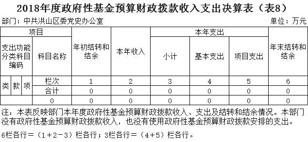 2018年政府性基金预算财政拨款上年结转和结余0.00万元,本年收入0.00万元,本年支出0.00万元,年末结转和结余0.00万元。即本部门没有政府性基金预算财政拨款收入,也没有使用政府性基金预算财政拨款安排的支出。